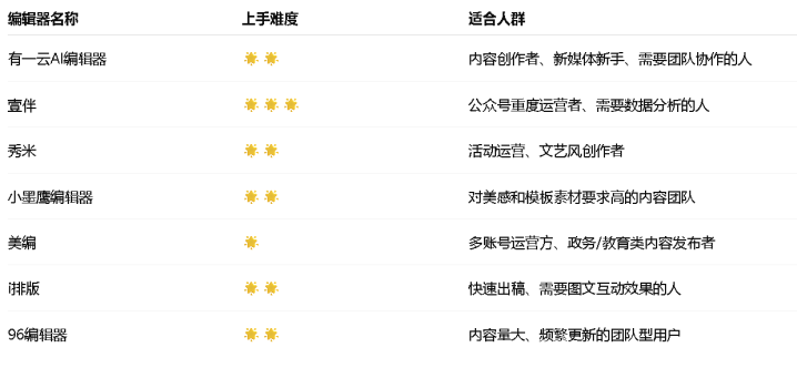 别急,这次我亲测了 7款目前主流的公众号编辑器,从【上手难度】【适合人群】两大维度,把它们拆开来讲个清楚👇